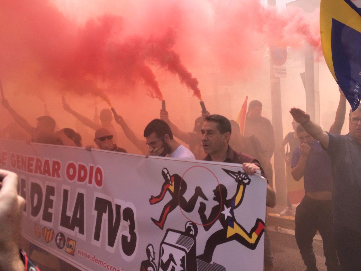 Spanish unionists and extreme right groups in protest outside Catalan TV3 station calling for it to be closed for 'promoting hate.' They're almost outnumbered by journalists and photographers.