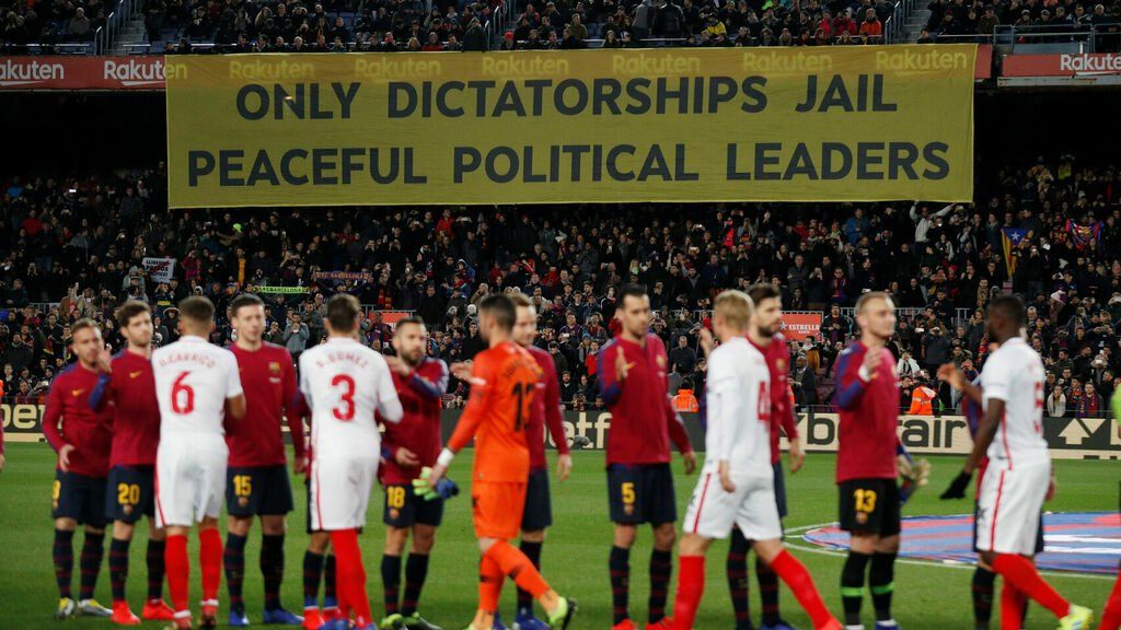 "Only Dictatorships Jail Peaceful Political Leaders." The banner at the Barça-Sevilla game tonight in the Camp Nou. #LlibertatPresosPolítics