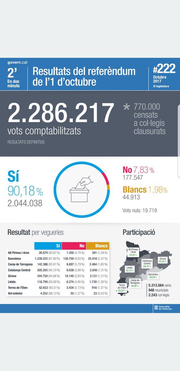 Final results of #CatalanReferendum with all votes counted. Well, except the seized ones...