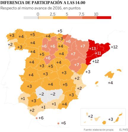 Voter turnout in Catalonia of 43.5% at 2 PM, which is up 11.2% over the last Spanish general election. This is a record for Catalonia, with especially notable increases in independentist areas. Usually about 1 million Catalan voters do not vote in Spanish general elections.