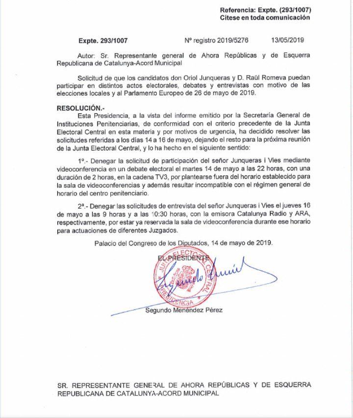 In the same ruling, Junqueras has also been denied permission to be interviewed on the radio on Thursday morning... because the videoconference room is already booked...